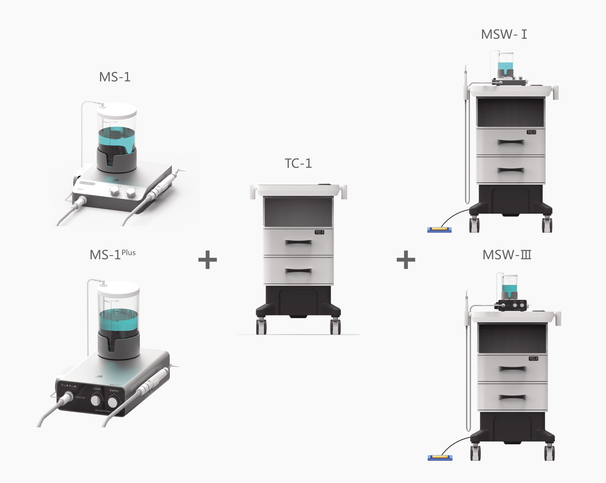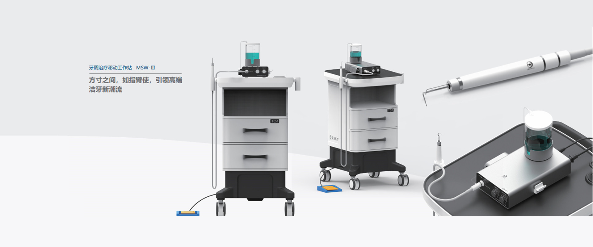 MS-1、MS-1Plus型超聲潔牙機(jī)分別與TC-1型多功能移動(dòng)醫(yī)療推車組合,可實(shí)現(xiàn)兩種組合方式。